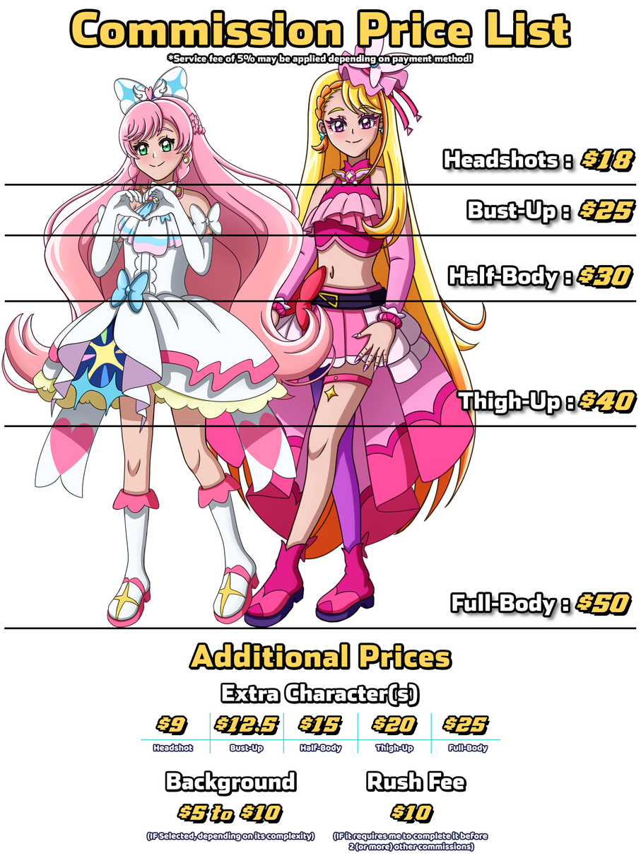 For Commercial commissions, the default and additional prices listed above will be multiplied by five times. Here are the prices for Commercial commissions after its adjustment.